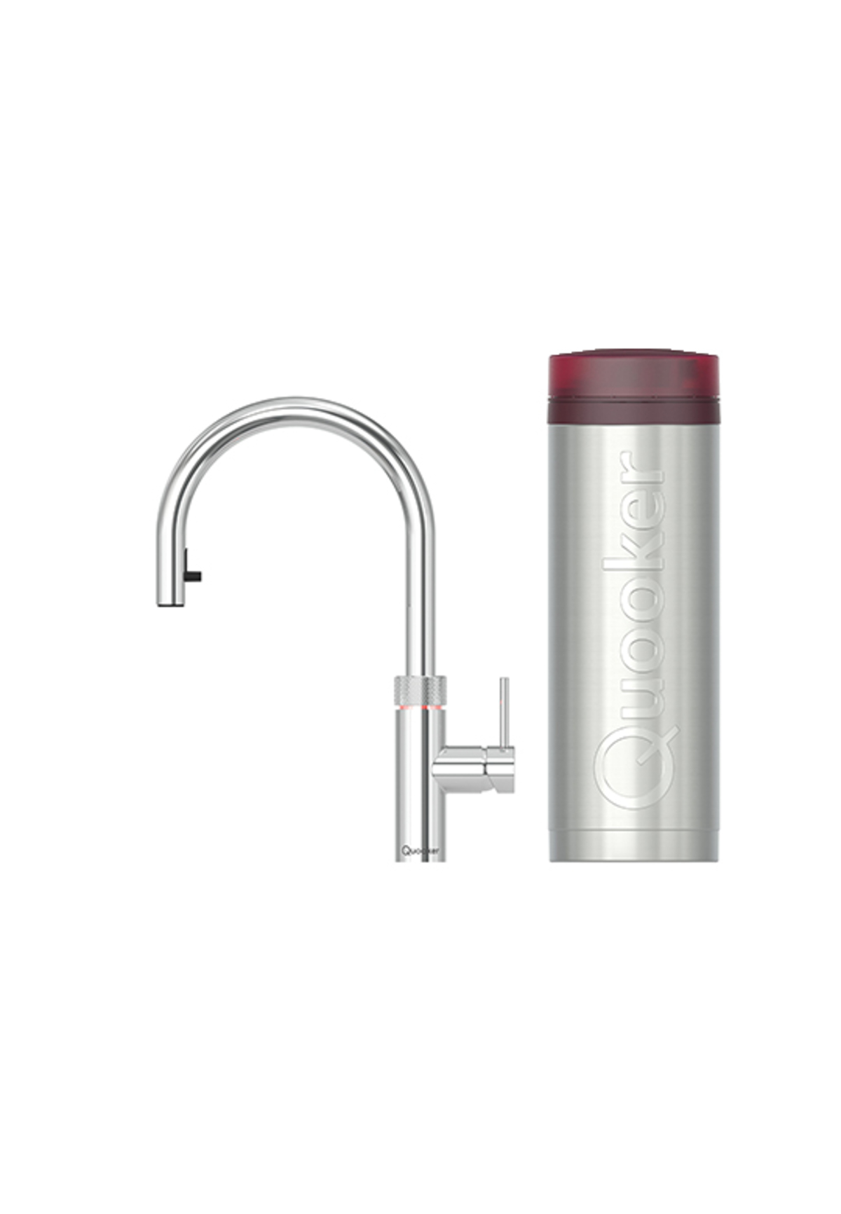 Zestaw bateria kuchenna z wyciąganą wylewką Flex Round plus zbiornik HOT 3L PRO3 Chrom System Quooker składa się z eleganckiej baterii montowanej na blacie kuchennym oraz zbiornika instalowanego w szafce pod spodem. Zbiornik PRO3 dostarcza wrzącą wodę o temperaturze 100 stopni bezpośrednio z kranu Quooker. Zwykła ciepła i zimna woda doprowadzana jest ze standardowego domowego źródła wody. Quooker Flex posiada wyciąganą wylewkę, która zapewnia większy zasięg podczas płukania, czyszczenia i napełniania garnków. Wyciągana wylewka nigdy nie podaje wrzątku, co gwarantuje pełne bezpieczeństwo.
