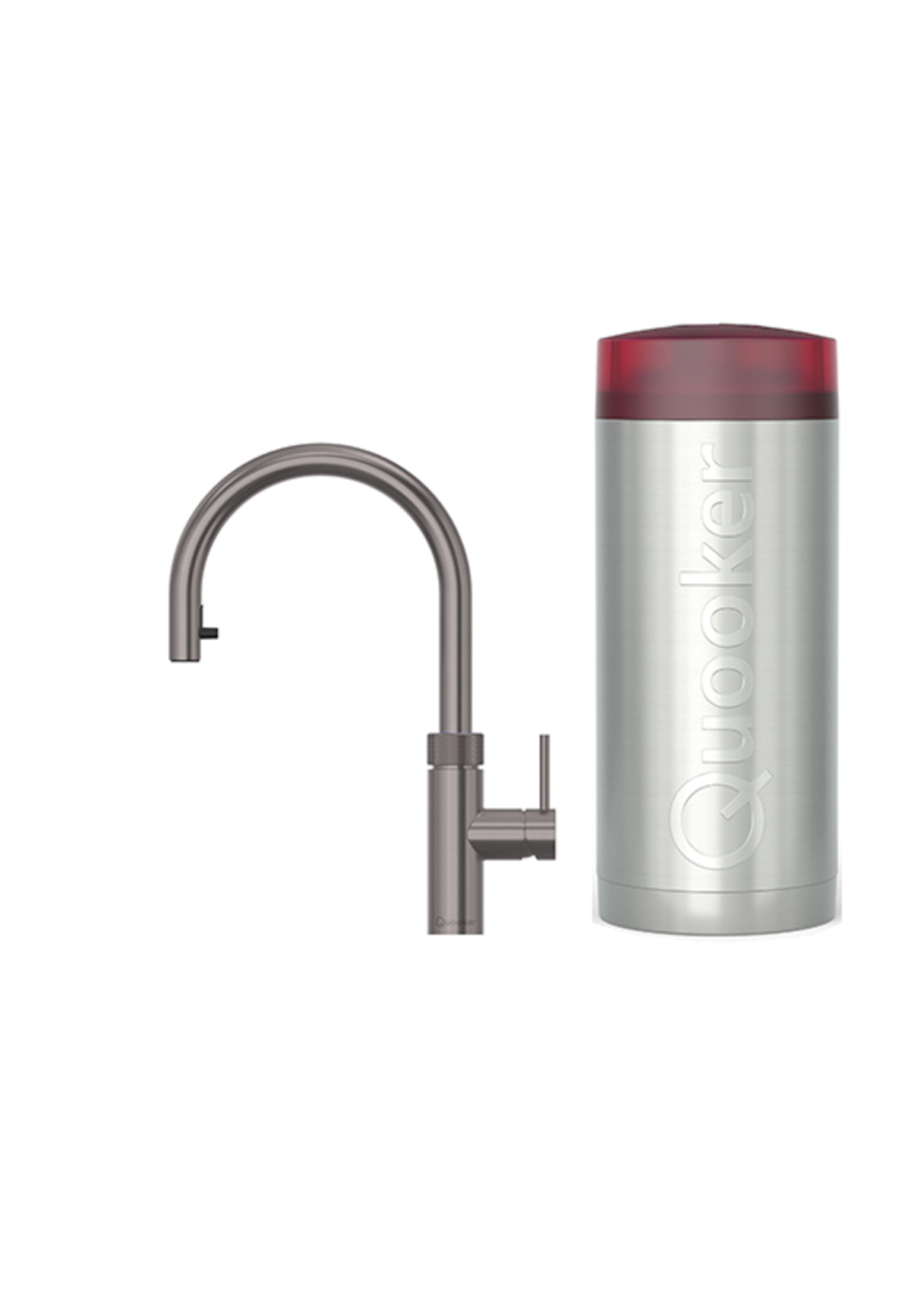 Quooker Zestaw bateria kuchenna z wyciąganą wylewką Flex Round plus zbiornik HOT 7L COMBI+ Gunmetal System Quooker składa się z eleganckiej baterii montowanej na blacie kuchennym oraz zbiornika instalowanego w szafce pod spodem. COMBI+ nie tylko dostarcza wodę w temperaturze 100 stopni, oraz ciepłą wodę (40 - 60 stopni), ale także łączy się z istniejącym systemem ciepłej wody. Oznacza to, że może zapewnić nieograniczone źródło ciepłej wody, łącząc wodę w zbiorniku z wodą z systemu, gdy zajdzie taka potrzeba. Quooker Flex posiada wyciąganą wylewkę, która zapewnia większy zasięg podczas płukania, czyszczenia i napełniania garnków. Wyciągana wylewka nigdy nie podaje wrzątku, co gwarantuje pełne bezpieczeństwo.
