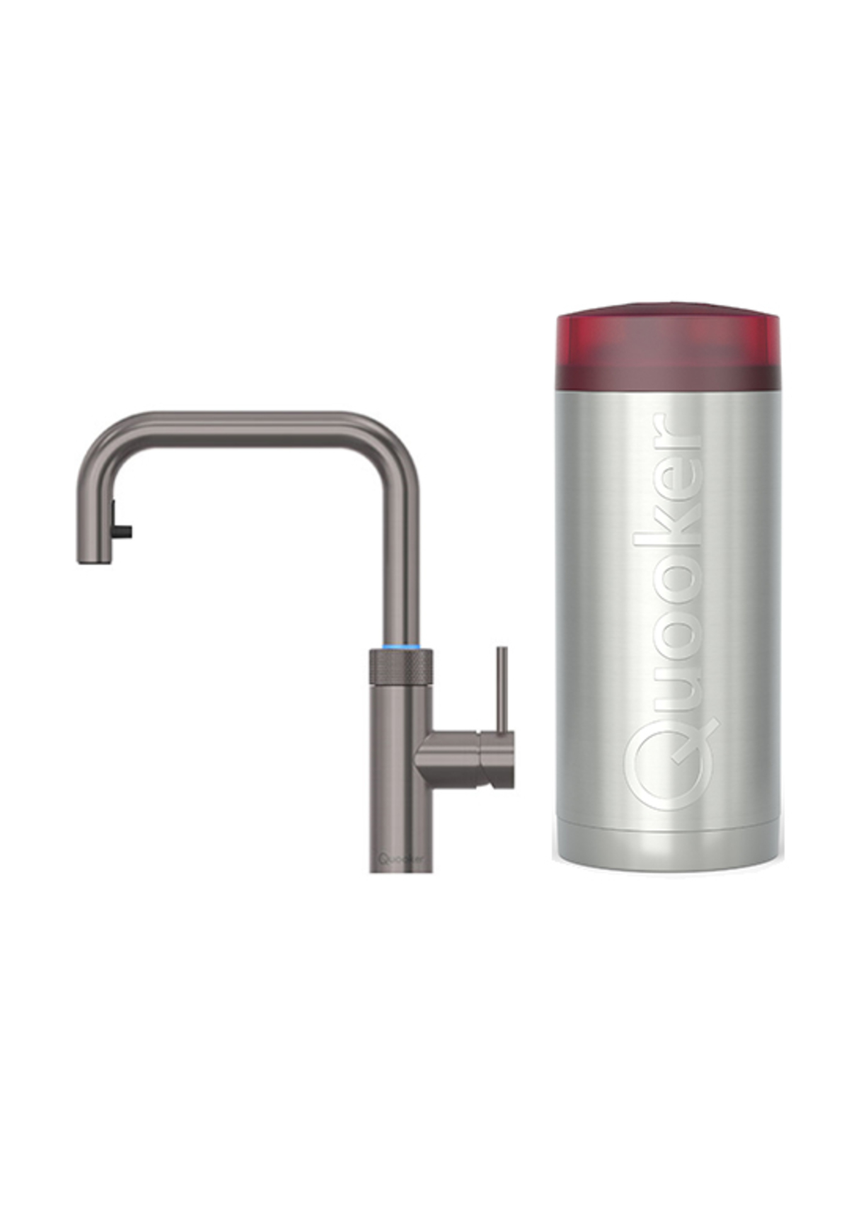 Quooker Zestaw bateria kuchenna z wyciąganą wylewką Flex Square plus zbiornik HOT 7L COMBI+ Gunmetal System Quooker składa się z eleganckiej baterii montowanej na blacie kuchennym oraz zbiornika instalowanego w szafce pod spodem. COMBI+ nie tylko dostarcza wodę w temperaturze 100 stopni, oraz ciepłą wodę (40 - 60 stopni), ale także łączy się z istniejącym systemem ciepłej wody. Oznacza to, że może zapewnić nieograniczone źródło ciepłej wody, łącząc wodę w zbiorniku z wodą z systemu, gdy zajdzie taka potrzeba. Quooker Flex posiada wyciąganą wylewkę, która zapewnia większy zasięg podczas płukania, czyszczenia i napełniania garnków. Wyciągana wylewka nigdy nie podaje wrzątku, co gwarantuje pełne bezpieczeństwo.