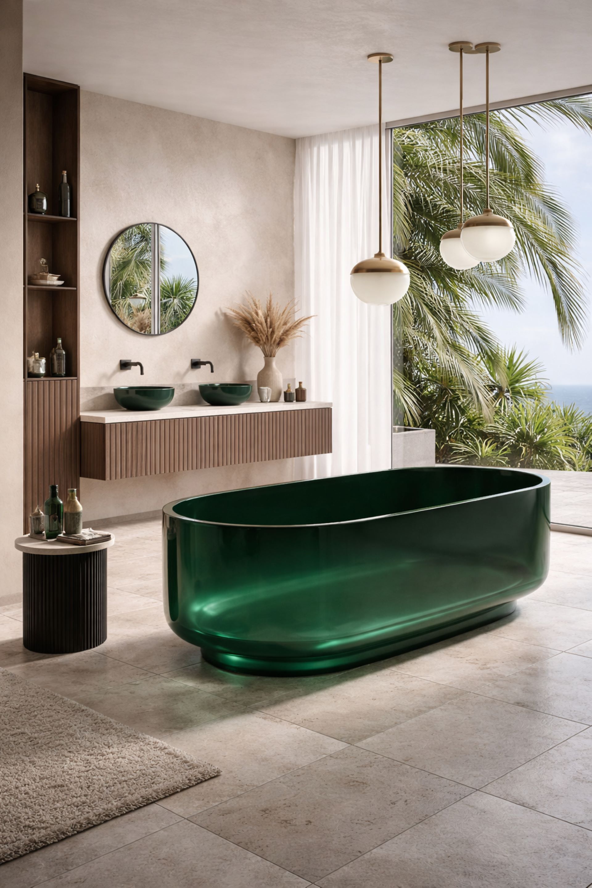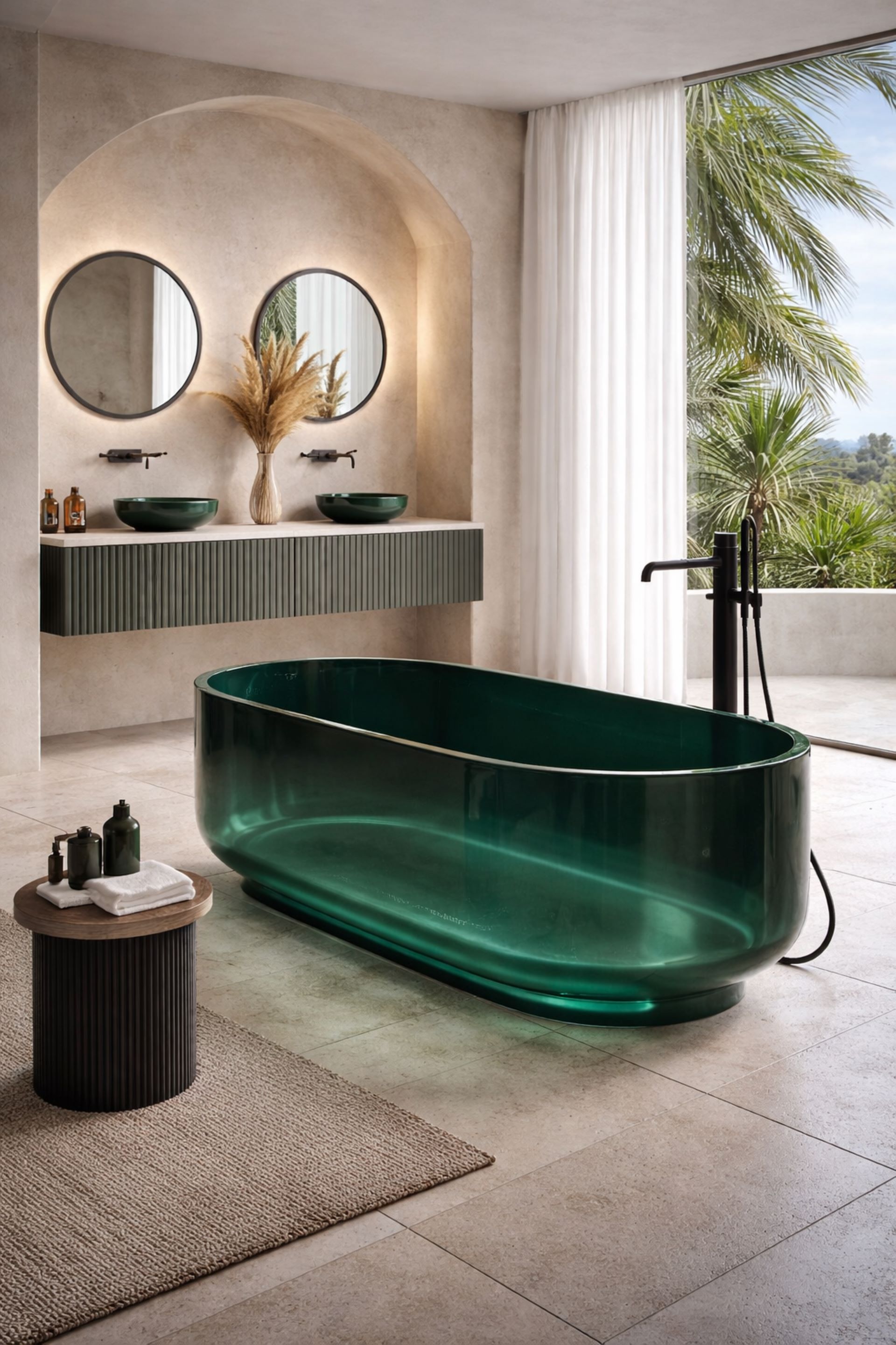 Wanna Antonio Lupi Borghi to wyjątkowy model wolnostojący wykonany z innowacyjnego materiału Cristalmood, który łączy efekt szkła z trwałością nowoczesnych kompozytów. Transparentna struktura oraz głęboki kolor Bottiglia (zieleń butelkowa) nadają wnętrzu ekskluzywny, designerski charakter.