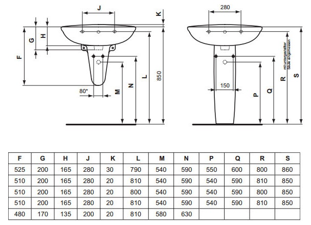 Postument do umywalek 70 cm, 65 cm, 60 cm, 55 cm: E7480, E7470, E7460, E7450