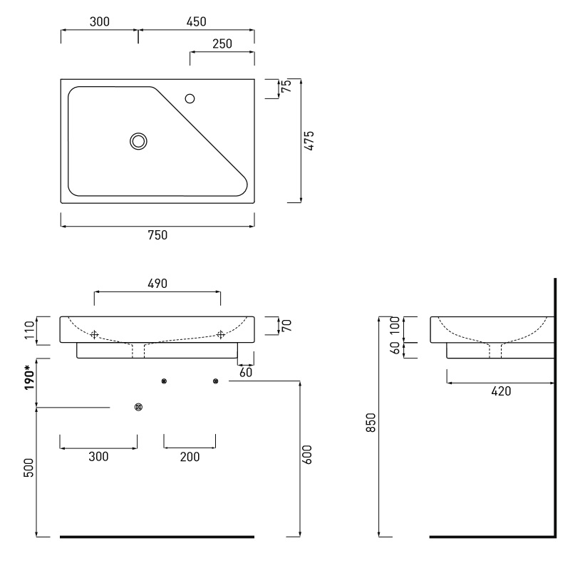 Umywalka ścienna z otworem na baterie w prawym górnym rogu