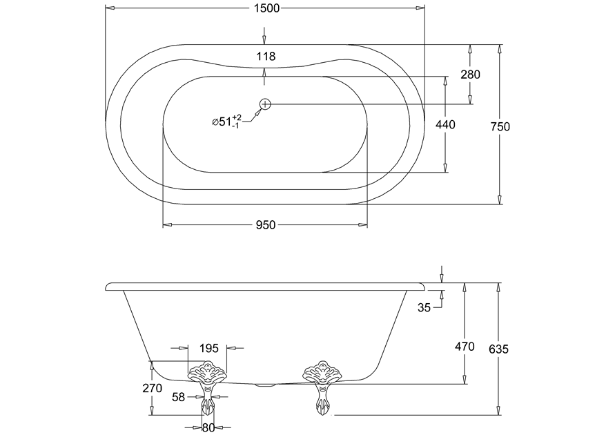 Zdjęcie poglądowe, przedstawia wannę z przykładowymi nóżkami