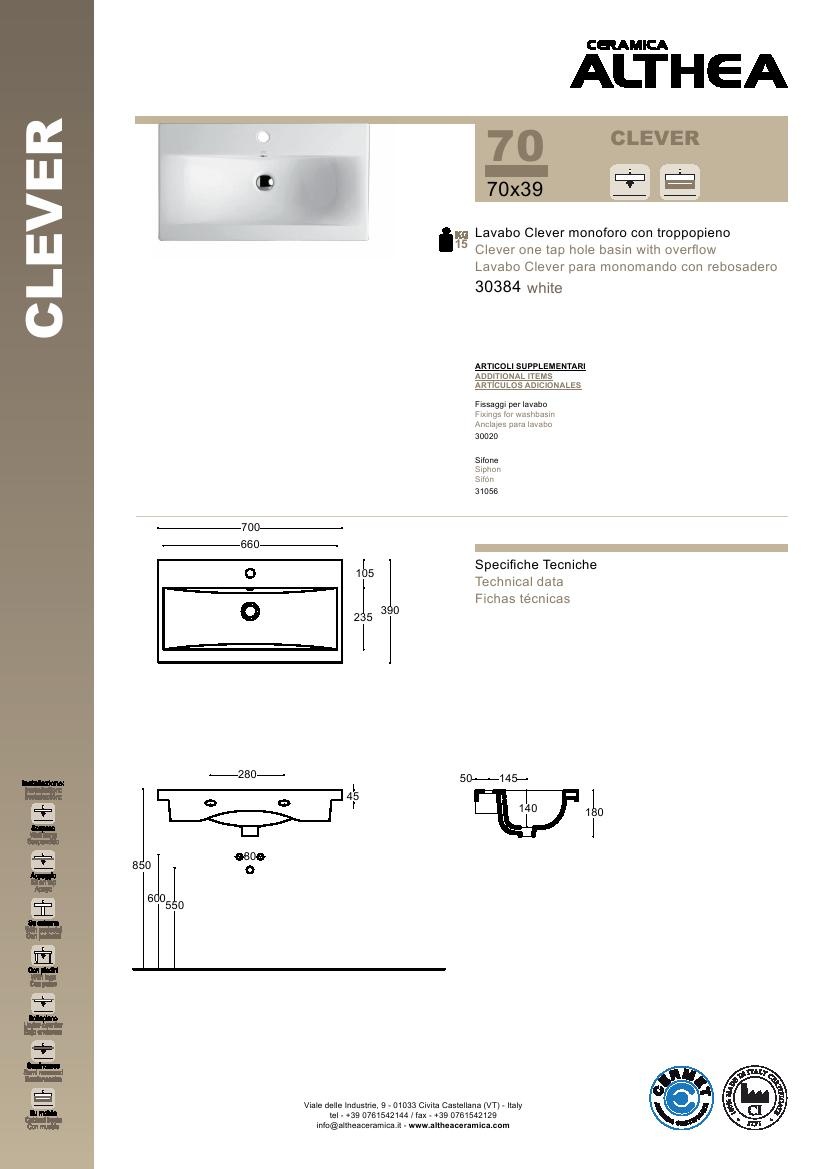 Althea Clever Umywalka ścienna 70x39 cm biała 30384 W MAGAZYNIE!!
