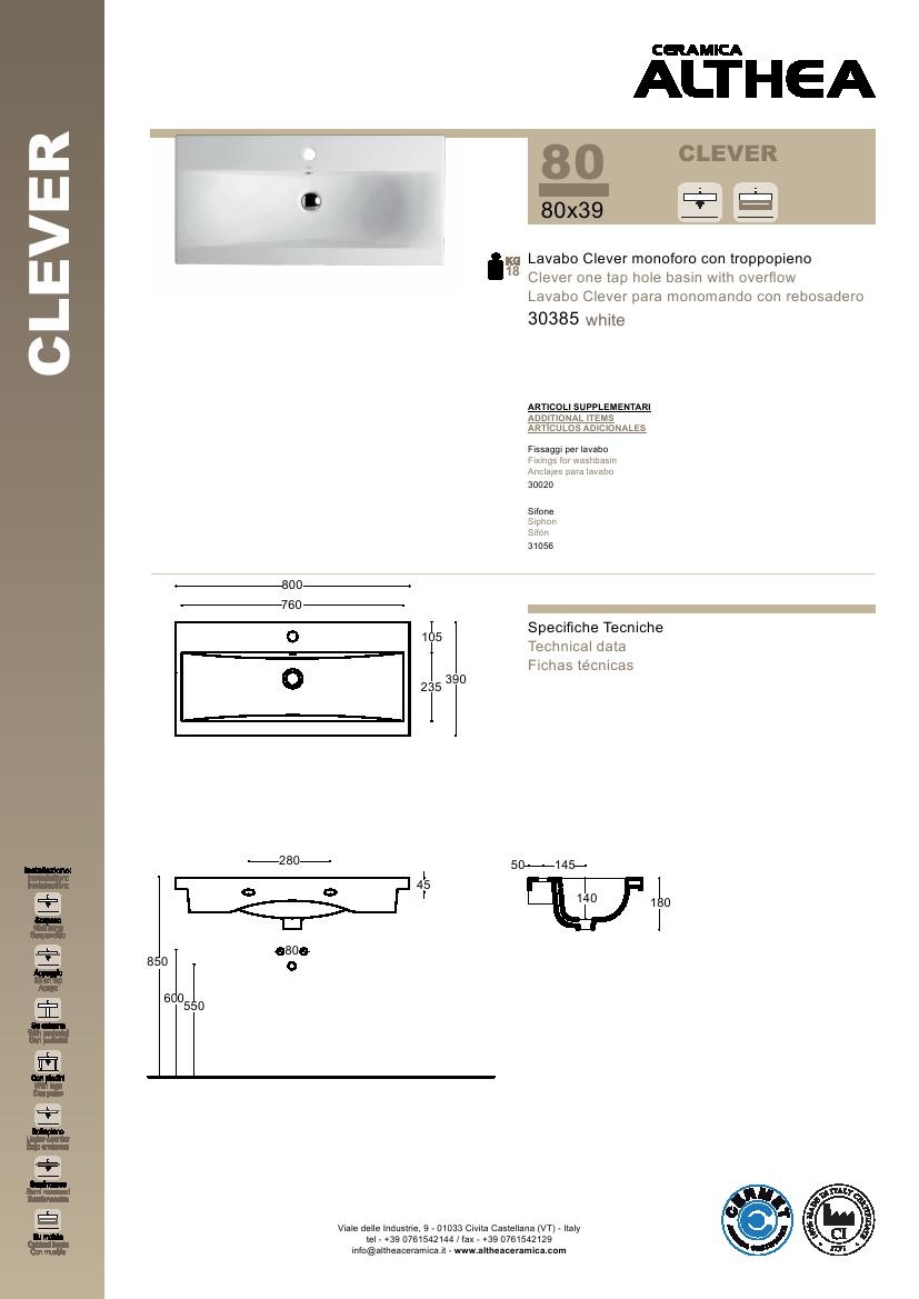 Althea Clever Umywalka meblowa ścienna 80x39 cm biała 30385