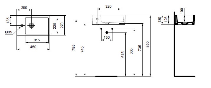 Otwór na baterię po lewej stronie. Umywalka jest bez typowego otworu przelewowego, należy skompletować z niezamykanym korkiem J3291AA. Brak zestawu montażowego, rekomendowany zestaw typu M10 x 140 mm K710767.
