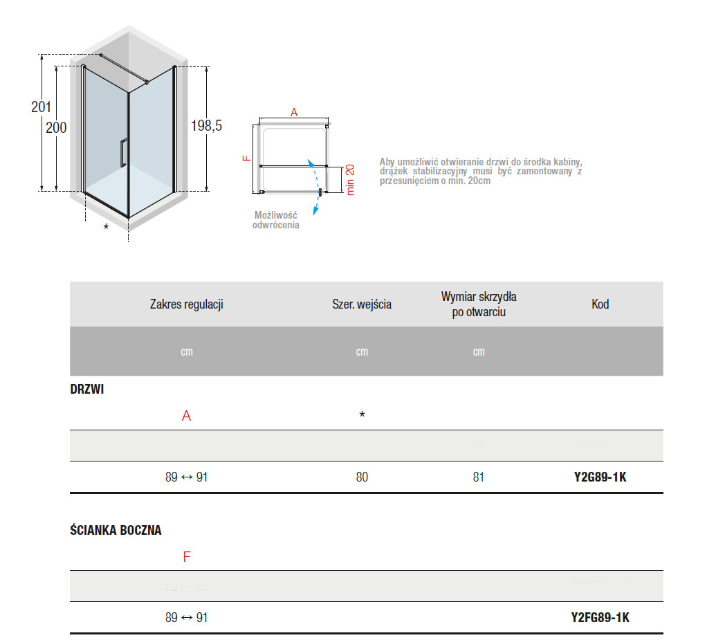 Aby umożliwić otwieranie drzwi do środka kabiny, drążek stabilizacyjny musi być zamontowany z przesunięciem o min. 20cm