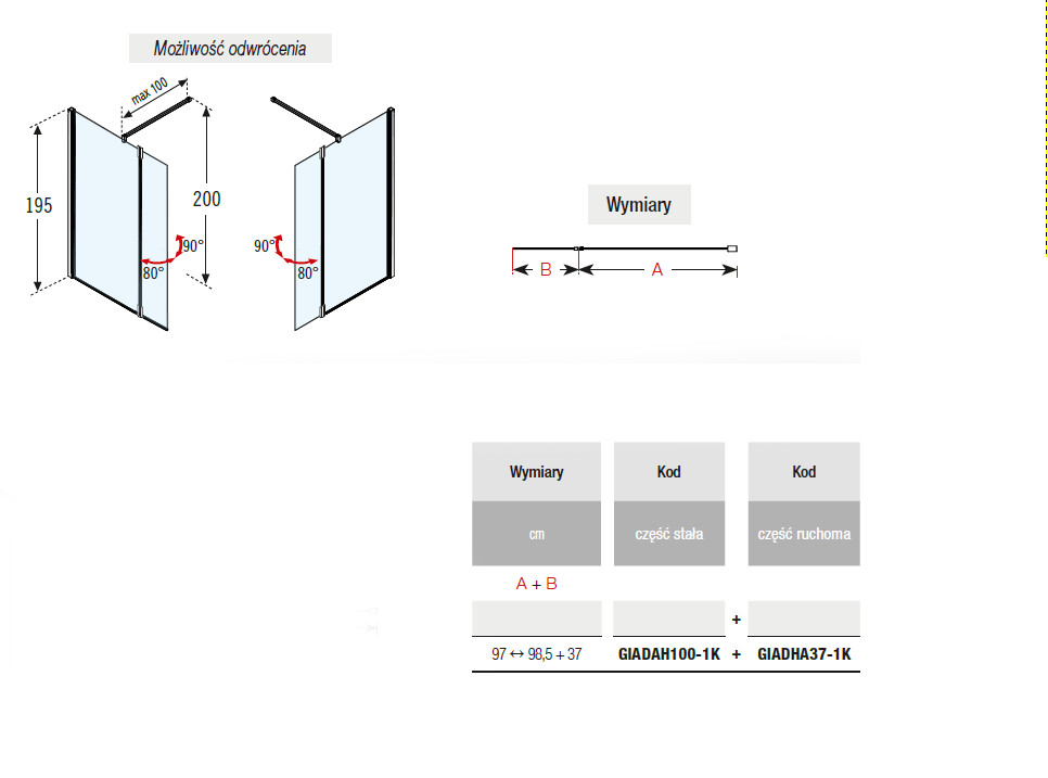 Novellini Giada H2 Ścianka stała ze skrzydłem obrotowym Wymiary kabiny: Wysokość: 195 cm Szerokość części stałej: 97 - 98,5 cm Szerokość części ruchomej: 37 cm