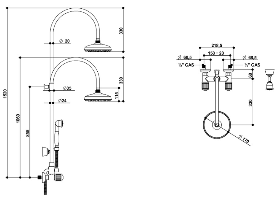 Bongio Cristallo bateria prysznicowa ścienna z prysznicem i deszczownią 04537/D