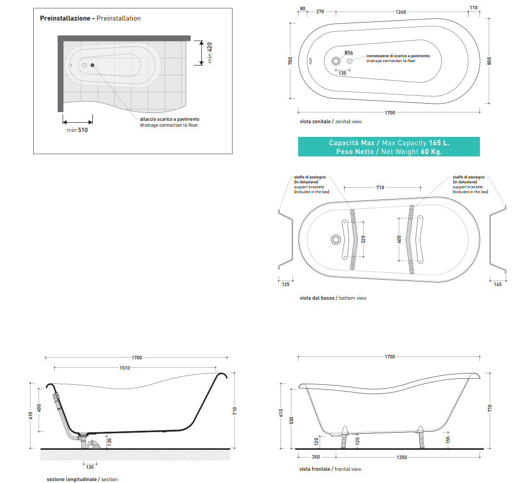 Flaminia Evergreen Wanna stojąca 170 cm Biała EG170Z nóżkami w wersji classic