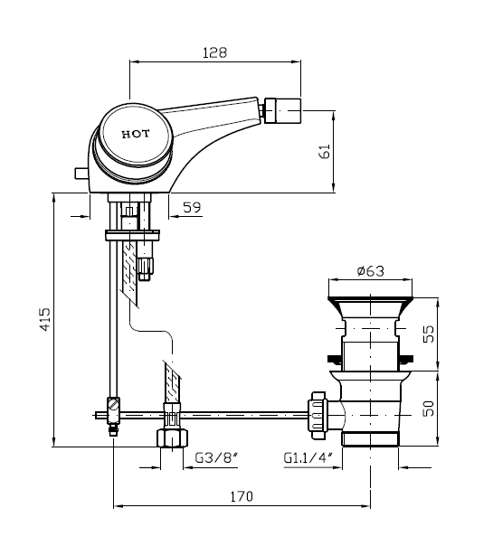 Bateria bidetowa, jednootworowa z perlatorem, korek 1¼”, wężyki elastyczne, wykoćzenie chromowane.