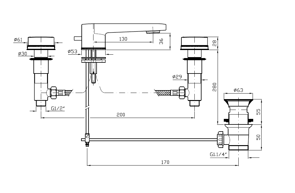 3-otworowa bateria umywalkowa z systemem ograniczającym rozchlapywanie, korek 1 ¼”, wężyki elastyczne, rozeta karbowana.