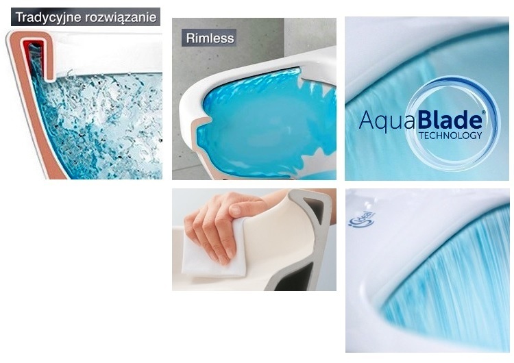 Miska wyposażona w specjalny system montażu, bez widocznych otworów przyłączeniowych.