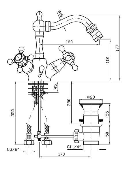 1-otworowa bateria bidetowa, wylewka stała z perlatorem, korek 1 ¼”, wężyki elastyczne.