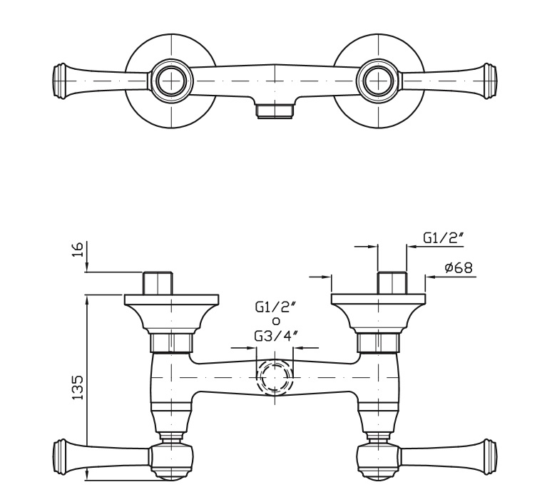 Bateria natryskowa naścienna z wyjściem ¾”, i reduktorem ½”.