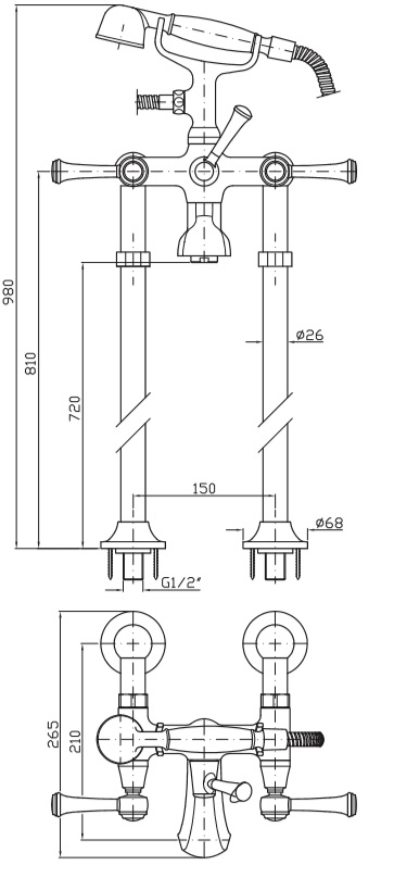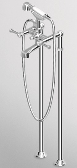 Bateria wannowo-natryskowa wolnostojąca z przełącznikiem, z zestawem prysznicowym, wężem elastycznym 1500 mm i kolumnami.