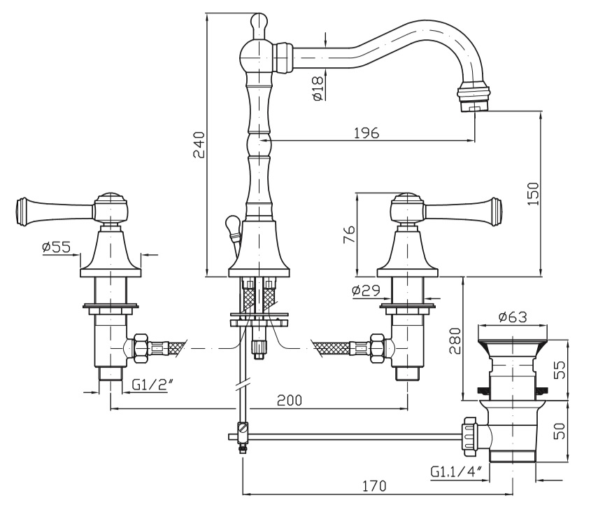 3-otworowa bateria umywalkowa, wylewka stała, z perlatorem, korek 1 ¼”, wężyki elastyczne.