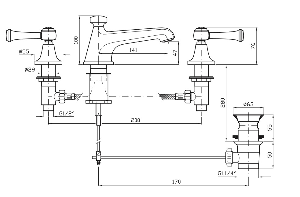 3-otworowa bateria umywalkowa z perlatorem, korek 1 ¼”, wężyki elastyczne