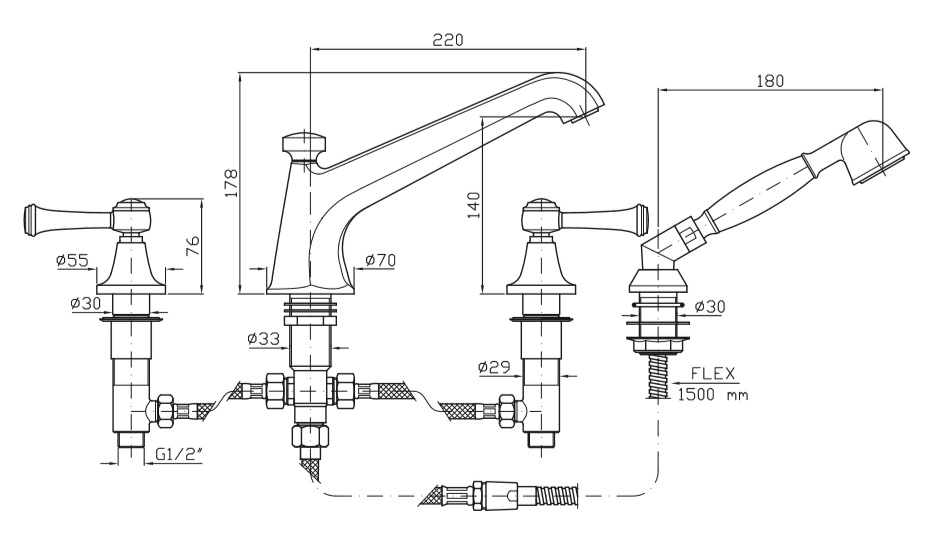 4-otworowa bateria wannowa, wylewka stała z przełącznikiem, wyciągana słuchawka Z9472P.C, wąż elastyczny 1500 mm.Wymiary: