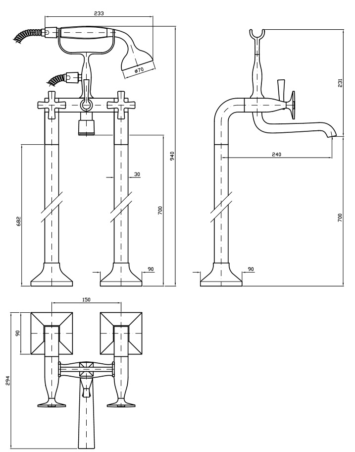 Bateria wannowo-natryskowa z przełącznikiem, wolnostojąca z zestawem natryskowym, wąż elastyczny 1500 mm
