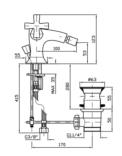 1-otworowa bateria bidetowa z perlatorem, korek 1 ¼”, wężyki elastyczne