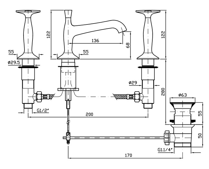 3-otworowa bateria umywalkowa z perlatorem, korek 1 ¼”, wężyki elastyczne