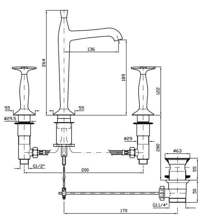 3-otworowa bateria umywalkowa z perlatorem, wylewka wysoka, korek 1 ¼”, wężyki elastyczne