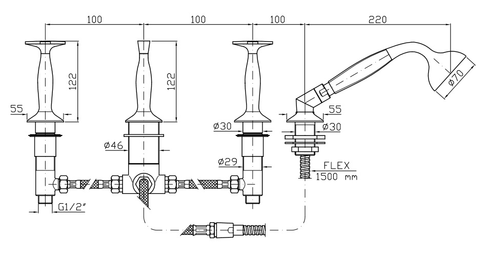 4-otworowa bateria wannowa, przełącznik, wyciągana słuchawka,Wymiary: