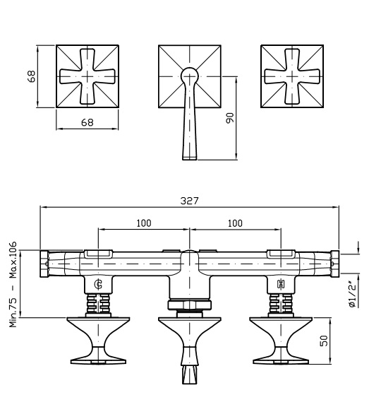 3-otworowa bateria wannowo-natryskowa podtynkowa z przełącznikiem 2-drogowym