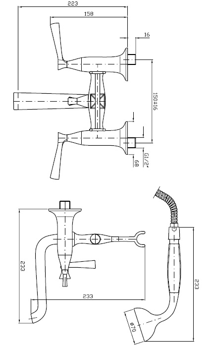 Bateria wannowo-natryskowa naścienna z przełącznikiem, słuchawka, wąż elastyczny 1500 mm.