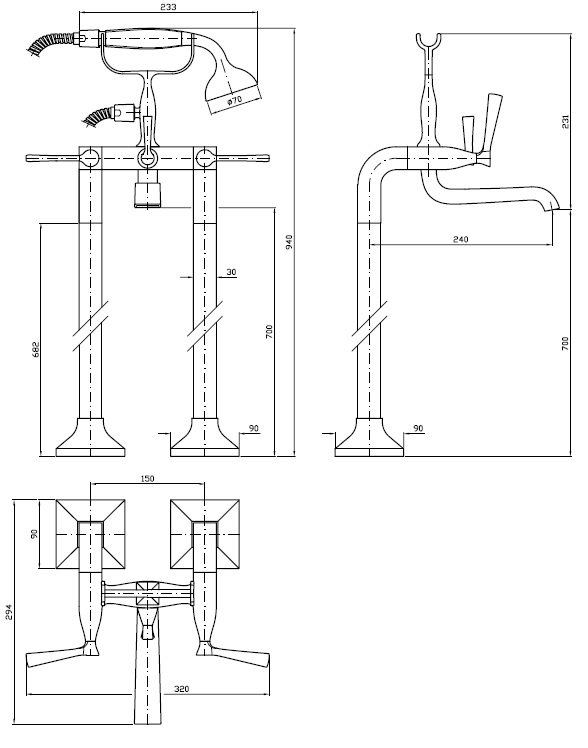 Bateria wannowo-natryskowa z przełącznikiem, wolnostojąca z zestawem natryskowym, wąż elastyczny 1500 mm