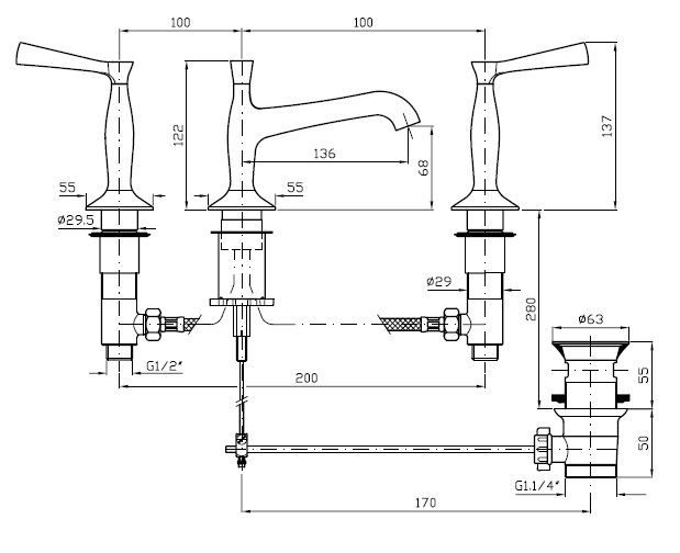 3-otworowa bateria umywalkowa z perlatorem, wylewka wysoka, korek 1 ¼”, wężyki elastyczne