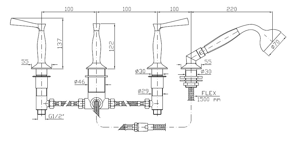 wąż elastyczny 1500 mm z możlwiością podłączenia napełniania przez przelew.