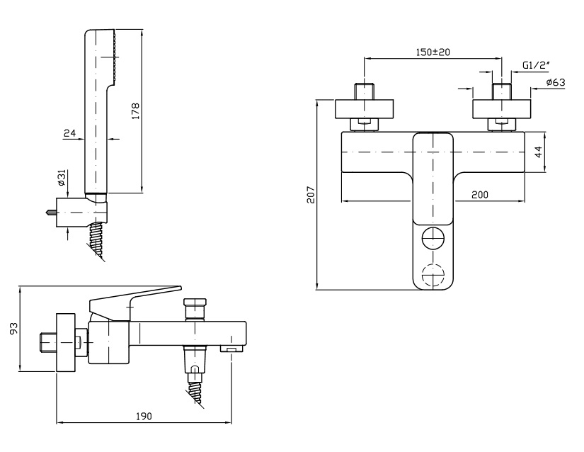 Jednouchwytowa bateria wannowo-natryskowa podtynkowa z przełącznikiem i zestawem natryskowym