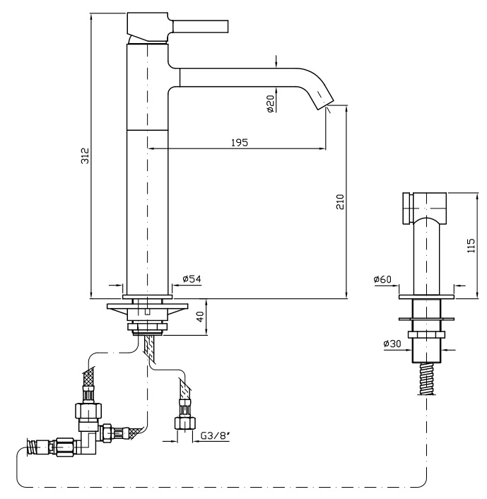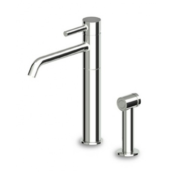 Jednouchwytowa bateria zlewozmywakowa z wylewką obrotową, słuchawka wyciągana z przełącznikiem, perlator, wężyki elastyczne.