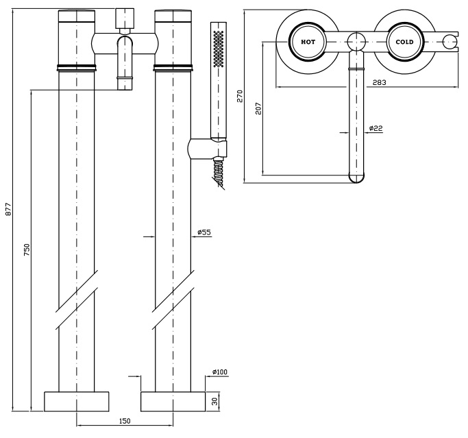 Wolnostojąca bateria wannowo - natryskowa z przełącznikiem, zestawem natryskowym, wąż elastyczny 1500 mm. Wysięg wylewki 175 mm