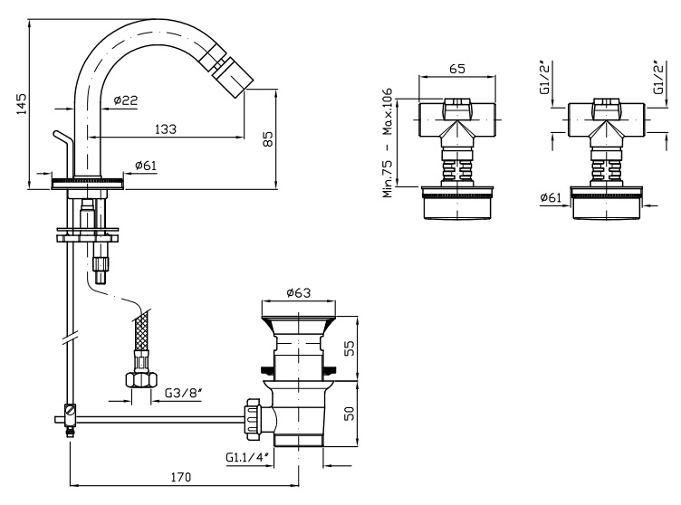 Bateria bidetowa podtynkowa z wylewką stojącą, korek 1¼” z wykończeniem chromowanym, rozeta karbowana.