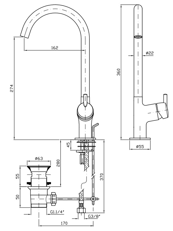Wymiary:Wysokość: 360 mmDługość wylewki: 162 mmCena dotyczy samej baterii