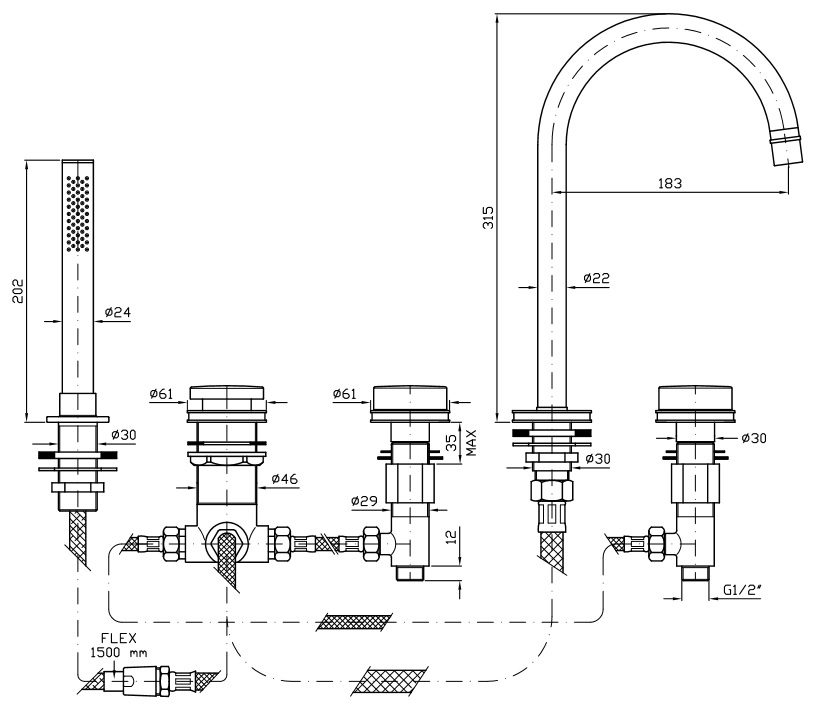 5-otworowa bateria wannowa, słuchawka Z94177 wyciągana, wąż elastyczny 1500 mm, rozeta gładka.