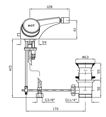 Bateria bidetowa, jednootworowa z perlatorem, korek 1¼”, wężyki elastyczne, wykończenie chromowane.