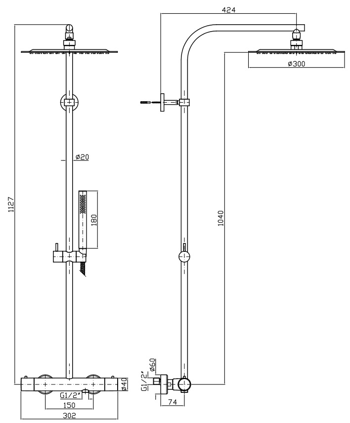 Kolumna z baterią termostatyczną naścienną, korpus termoizolowany, deszczownia ze stali nierdzewnej Ø 300 mm o grubości 3 mm, słuchawka mosiężna