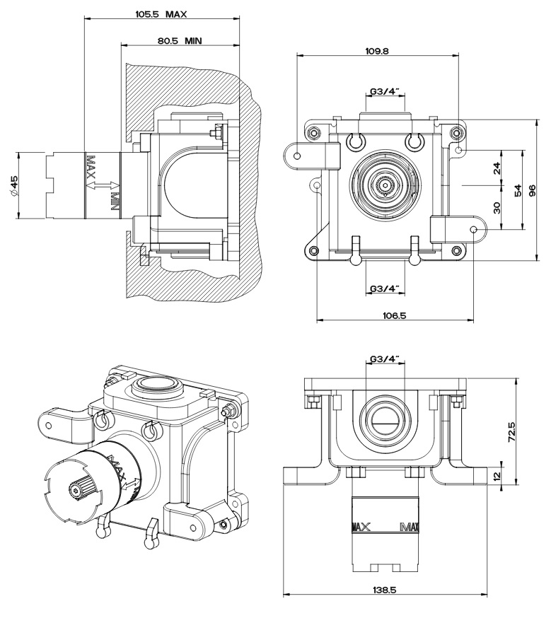 Element podtynkowy do baterii termostatycznej natryskowej.