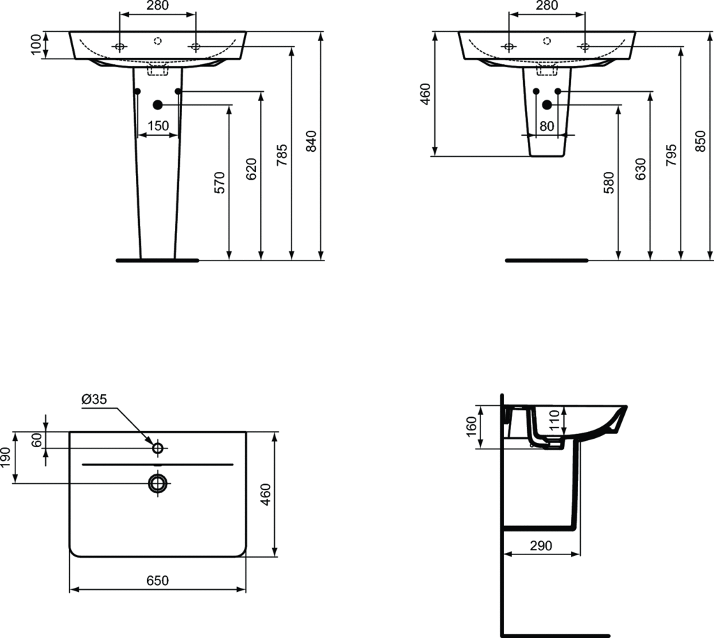 Otwór na baterię. Możliwość skompletowania z postumentem E074901, półpostumentem E074801, odpowiednimi meblami lub z syfonem dekoracyjnym. Brak zestawu montażowego, rekomendowany zestaw typu M10 x 140 mm.