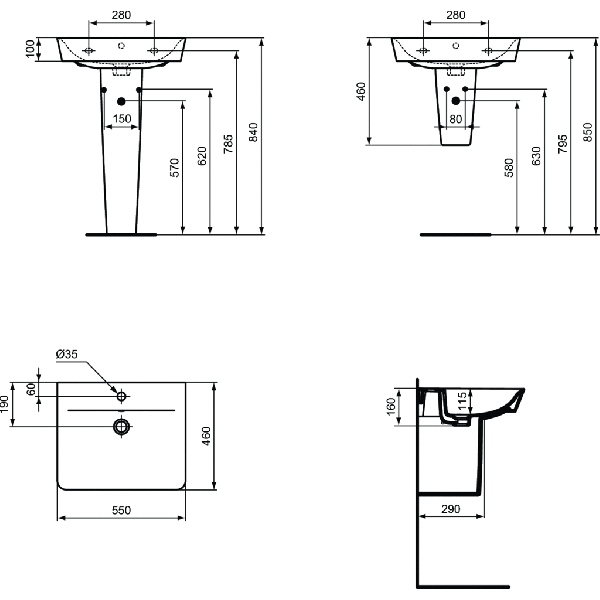 Otwór na baterię. Możliwość skompletowania z postumentem E074901, półpostumentem E074801, odpowiednimi meblami lub z syfonem dekoracyjnym. Brak zestawu montażowego, rekomendowany zestaw typu M10 x 140 mm.