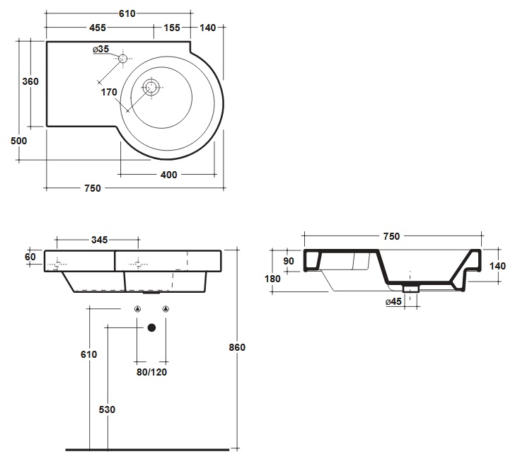 Olympia Ceramica Tutto-evo Umywalka ścienna 75 cm z półką po lewej stronie, Biały TUT417D101