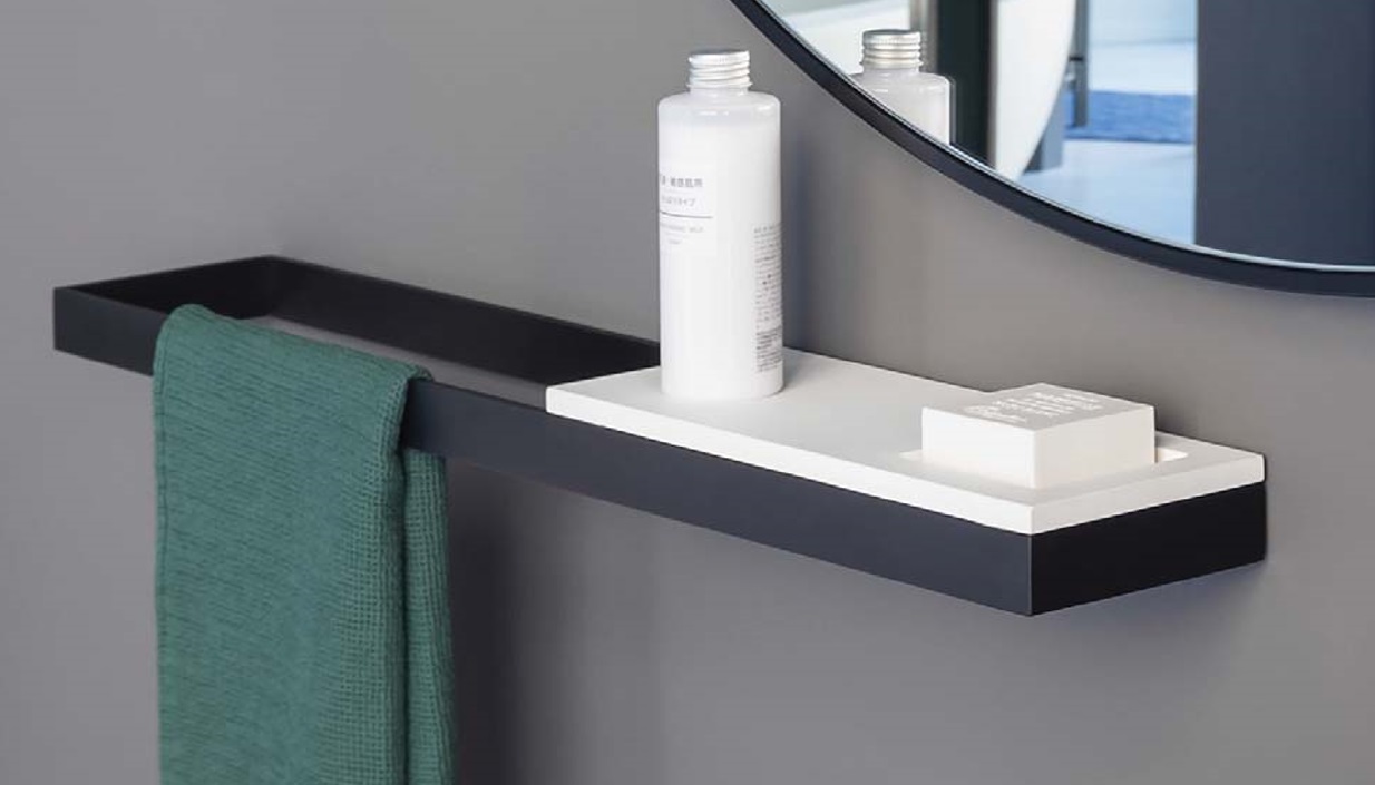 zdjęcie poglądowe przedstawia półkę z wgłębieniem na mydło i dozownik