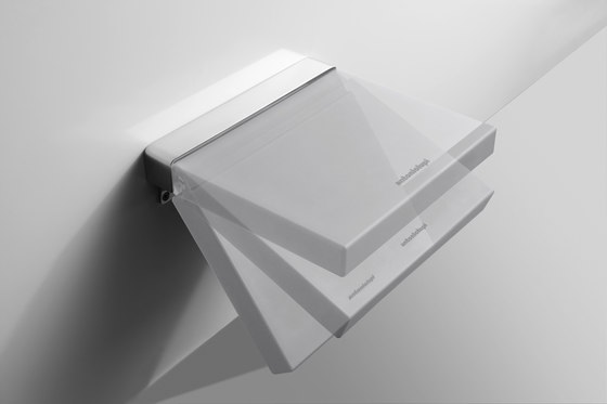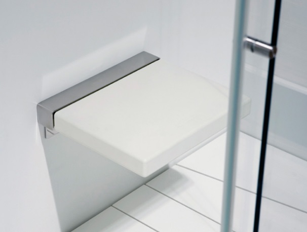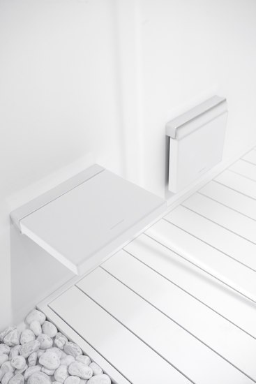 Siedzisko składane montowane do ściany ze wspornikami ze stali nierdzewnej.