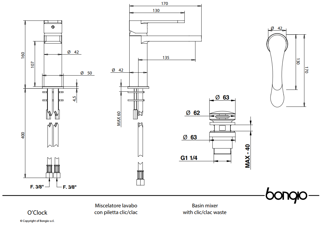 Bongio O'Clock Green Bateria umywalkowa jednootworowa z korkiem Click-Clack czarny mat 14521/GRNE
