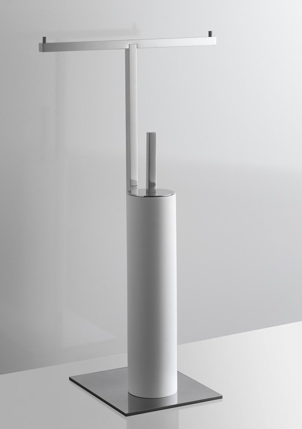 Wolnostojący zestaw Łazienkowy ze stali nierdzewnej z pojemnikiem w kolorze białym i szczotką WC oraz podwójnym relingiem na papier toaletowy/ręcznik.