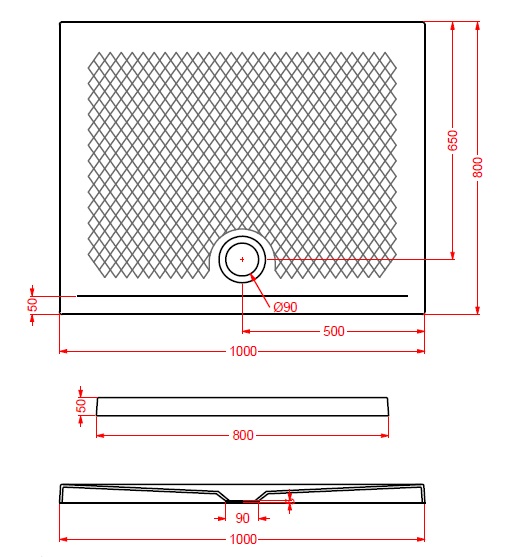 Brodzik z odpływem przy dłuższym boku.